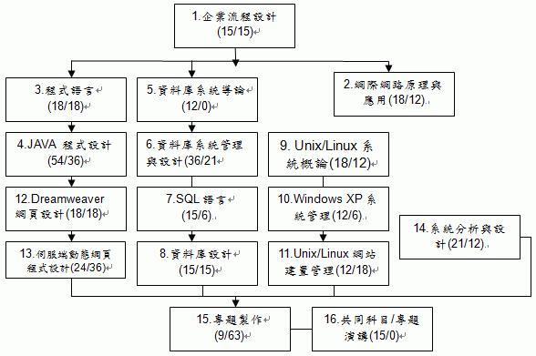 這班的上課科目如下圖,一個課程有兩種時數是表示上課(學科)與實作(術科)的分配狀況。比較有趣的是,我應該算是本班正式課程的第一堂講師,而最後一堂課專題製作恰巧也是我教的,我應該算是另類的「有始有終」參與啦,笑~!