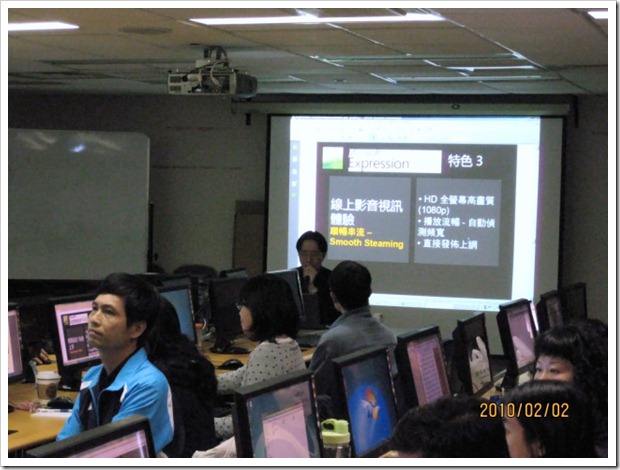這是教室後面另外一台單槍投影機,雖然整個場地有前後兩台投影機,不過由於場地裡沒有廣播教學系統可以直接將講師的畫面傳到學員端,教學起來確實效果會打點折扣,第二天的課Expression Encoder Screen Capture會用到耳麥,但好像有帶耳麥的人仍很少,比較無法實際體驗到自己錄製聲音教學檔的樂趣。
