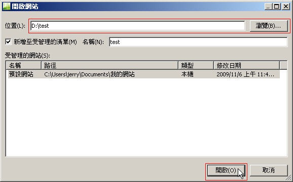 按下「瀏覽」鈕,選擇一個您要存放的目錄位置後,按下「開啟」鈕。