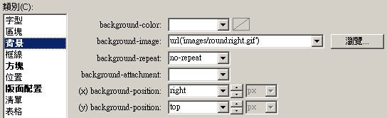 在「管理樣式」介面上,點選「#outerWrapper .ubercolortabs a span」後按下滑鼠右鍵,選擇「修改樣式」,在「背景」的頁面標籤裡,可以看得到對roundright.gif的相關設定。