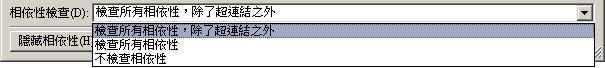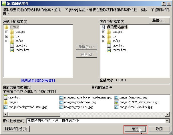 當然再新增之前,您也可以點選「顯示相依性」鈕,會出現相依性檢查的選項,可以在此選擇您是否要讓Expression Web幫您做檢查,以免屆時匯出的檔案有所疏失遺漏,再此筆者是建議您選擇「檢查所有相容性,除了超連結之外」的選項,應可符合絕大部分情況面臨的需求了。