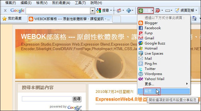 另外,筆者在此分享一個使用 Ping.fm 的小秘訣,您可以安裝Google工具列到瀏覽器裡,安裝完在瀏覽器的Google工具列裡,選擇「分享」/「設定」。