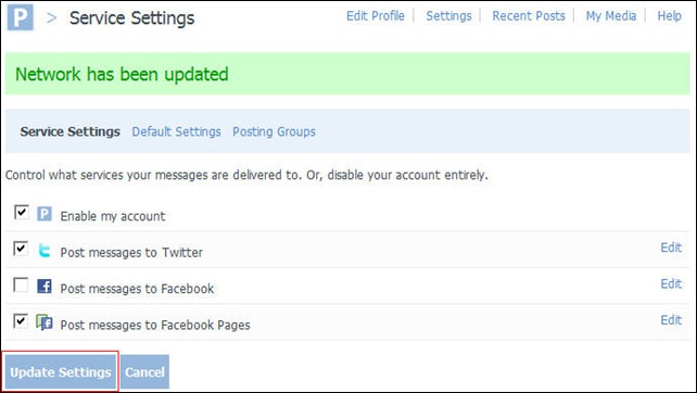 出現目前使用串連的服務清單如下,筆者因為不需要Facebook個人頁面在此做訊息更新,因此取消「Post messages to Facebook」前面的勾選,按下「Update Settings」鈕。