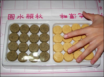 總共32個餅(棋子),其實就是綠豆糕啦,只是做的比較精細,變成象棋造型,兩種口味,還有附上一張象棋紙與兩個塑膠袋手套。