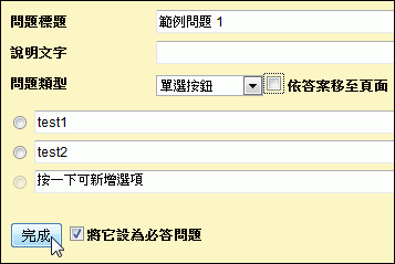 當設定好一個問題後,如果需要設定成此問題讓填表者為必填,則可以勾選「將它設為必答問題」,完成問題編輯設定後,請按下「完成」鈕。