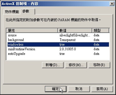 「名稱」請輸入「windowless」,「資料」請輸入「true」,按下「確定」鈕。關於windowless屬性的細節說明,若您有興趣,可以到此處的MSDN取得更詳細資料。