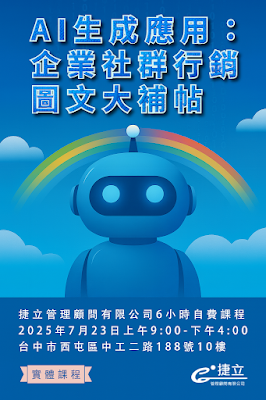 捷立管理顧問「AI生成應用: 企業社群行銷 圖文大補帖」7月23日台中市6小時自費課程,確定開課尚有名額,歡迎有興趣的朋友報名參加